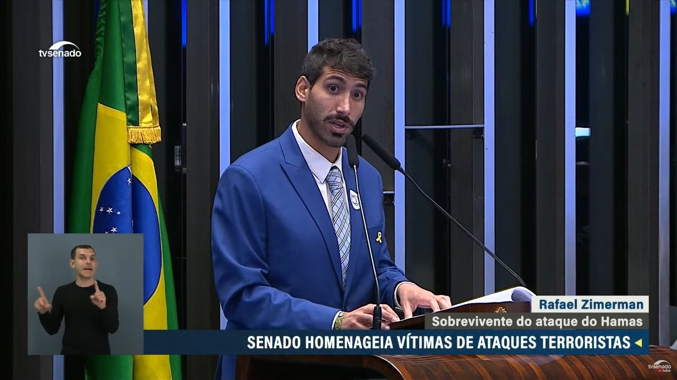 A sessão solene ainda contou com a presença de Rafael Zimerman, um brasileiro que sobreviveu ao ataque do Hamas durante o festival Nova, em Israel.