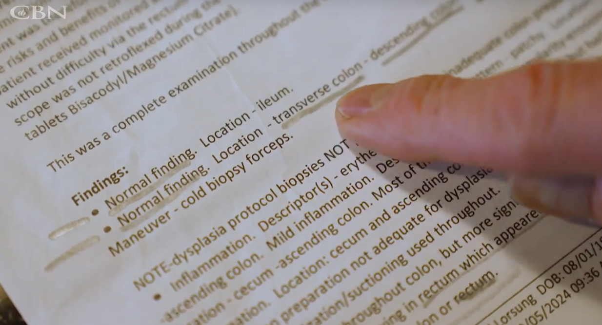 Tempos depois, John e sua esposa assistiam ao programa cristão "The 700 Club" quando o apresentador fez uma oração específica por pessoas com colite ulcerativa.
